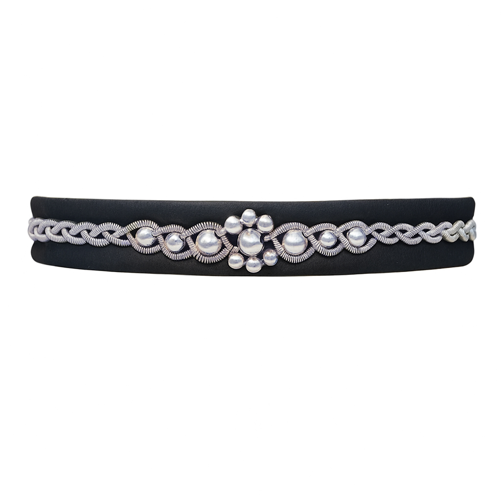 Denna fläta i tenntråd har inflätade pärlor i silver i form av en blomma/snöflinga. Flätan är fastsydd på svart läderbas av naturgarvat renskinn och är ca 8 mm brett. Armbandet har en renhornsknapp som knäppning.