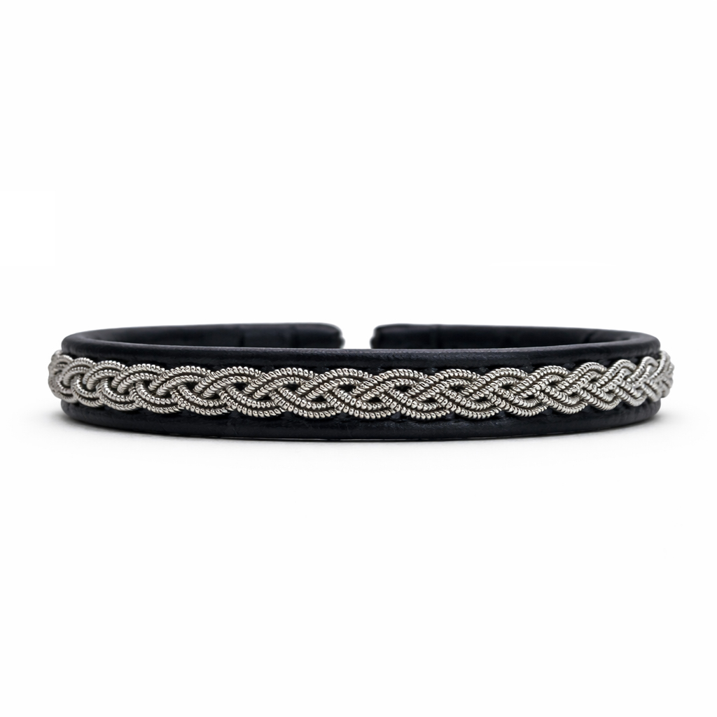Ett av våra smalare armband som är ca 1,3 cm brett. Denna fläta i grå koppar/tenntråd är den mest traditionella och är fastsydd på svart läderbas av naturgarvat renskinn. Armbandet har en renhornsknapp som knäppning.