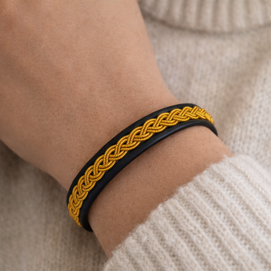 Ett av våra smalare armband som är ca 1,3 cm brett. Denna fläta i gul koppar/tenntråd är den mest traditionella och är fastsydd på svart läderbas av naturgarvat renskinn. Armbandet har en renhornsknapp som knäppning.