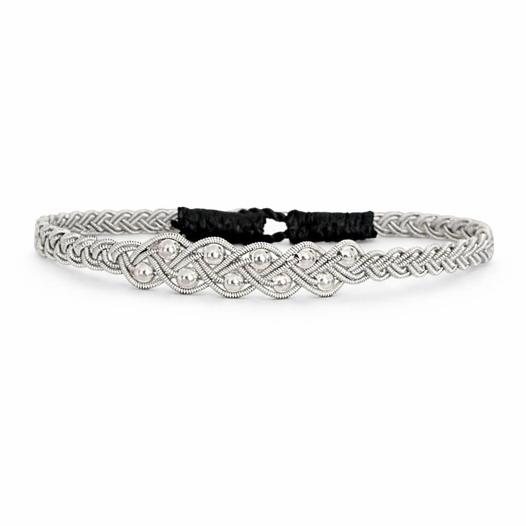Ett elegant och tidlöst armband där traditionellt hantverk möter stilren design. Armbandet är flätat av samma tenn/silvertråd som används i klassiska tennarmband, men här i en ren och lätt design.