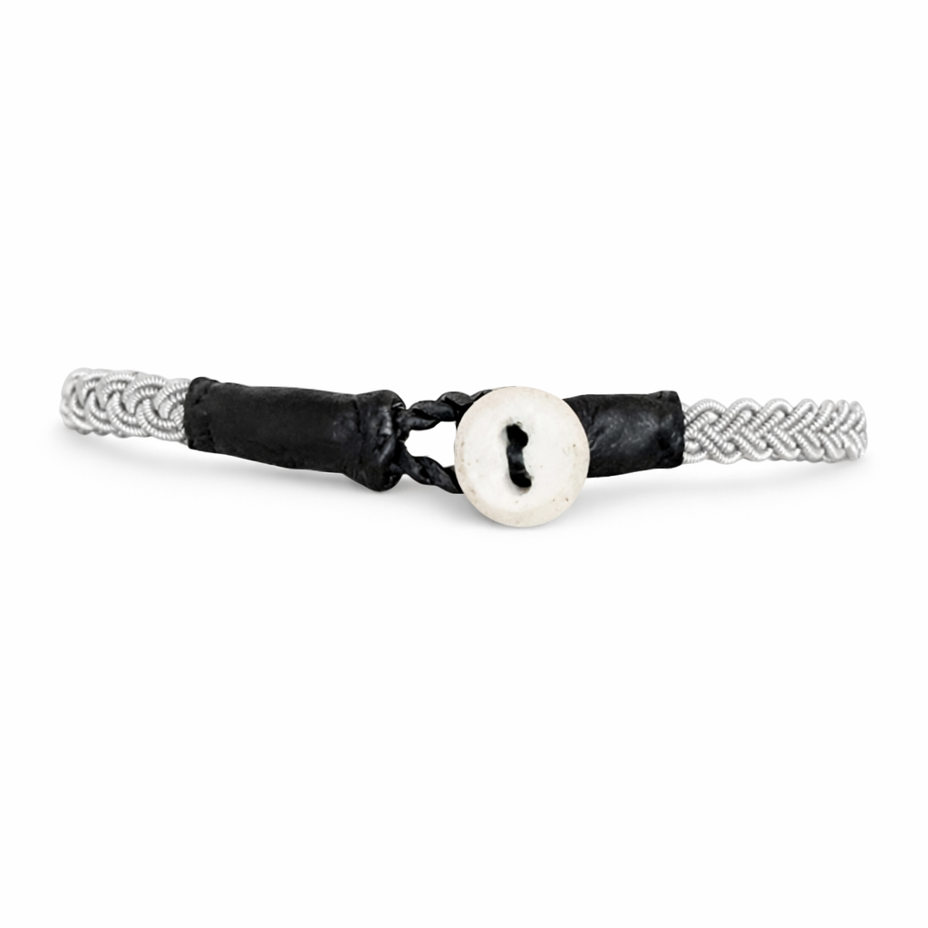 Detta armband har den klassiska knäppningen i renskinn och en renhornsknapp.