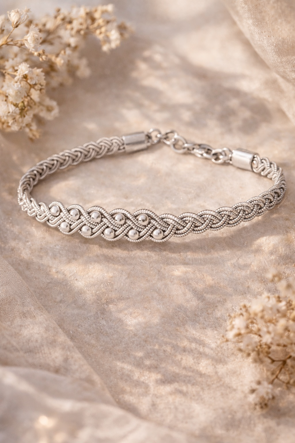 Ett elegant och tidlöst armband där traditionellt hantverk möter stilren design. Armbandet är flätat av samma tenn/silvertråd som används i klassiska tennarmband, men här i en ren och lätt design utan renskinn.