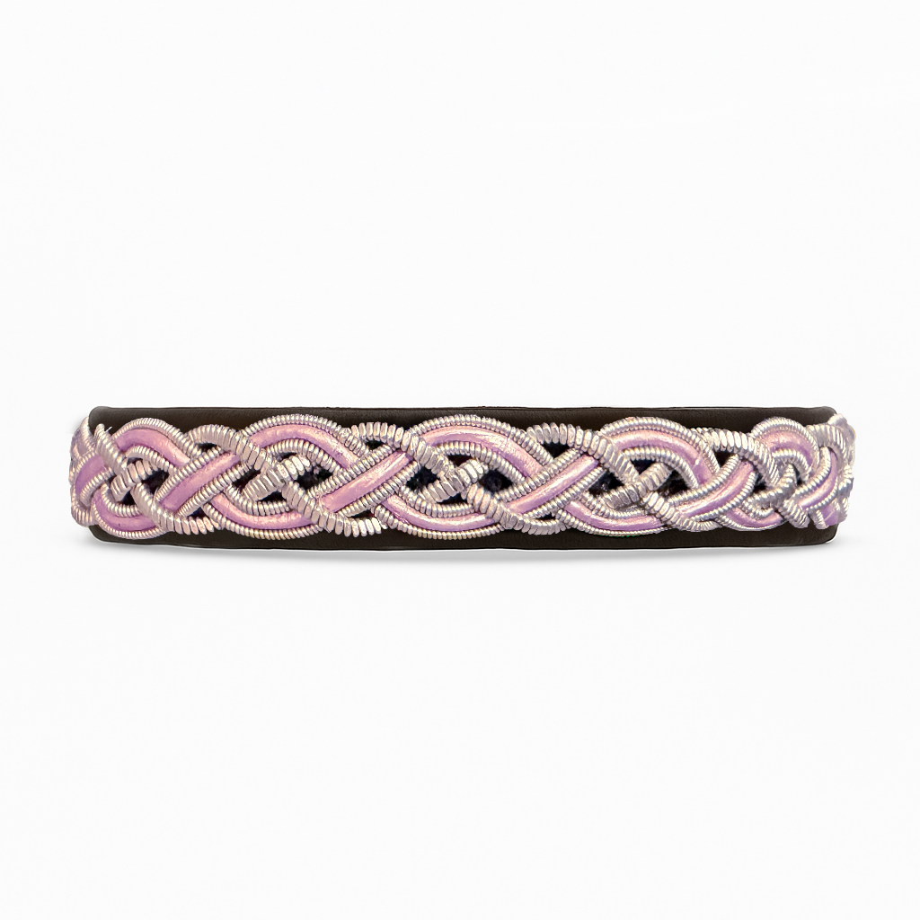 Ett av våra lite bredare armband som är ca 1,3 cm brett. Flätan är gjord i både rund och platt tenntråd, och har inflätat läderband i rosa pärlemor.