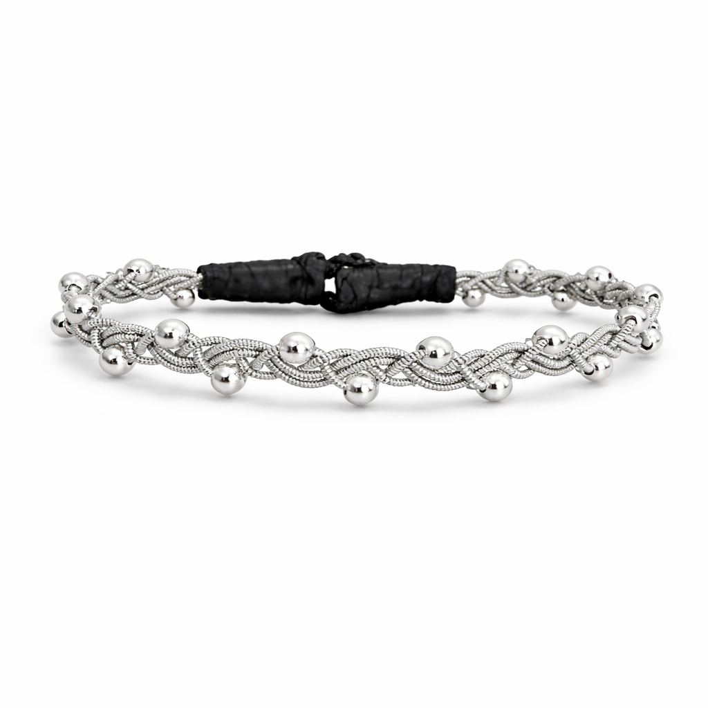 Ett elegant och tidlöst armband där traditionellt hantverk möter stilren design. Armbandet är flätat av samma tenn/silvertråd som används i klassiska tennarmband, men här i en ren och lätt design.