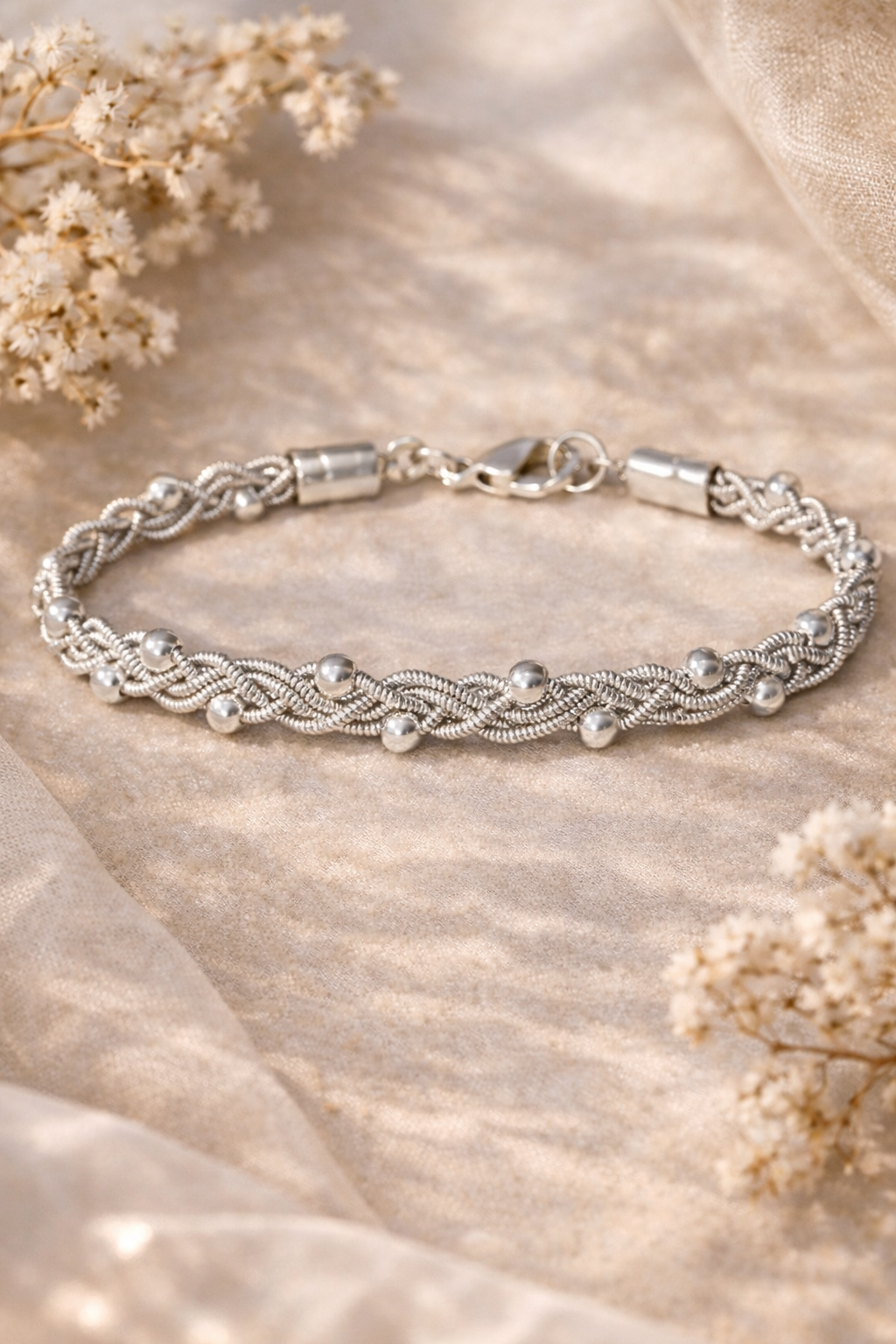 Ett elegant och tidlöst armband där traditionellt hantverk möter stilren design. Armbandet är flätat av samma tenn/silvertråd som används i klassiska tennarmband, men här i en ren och lätt design utan renskinn.