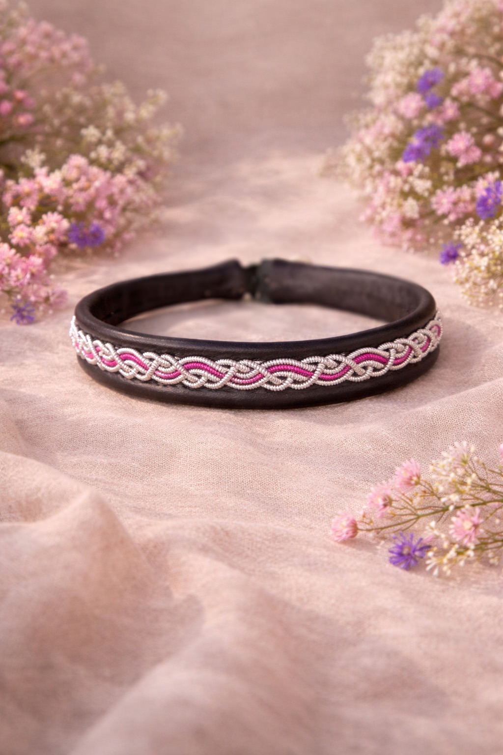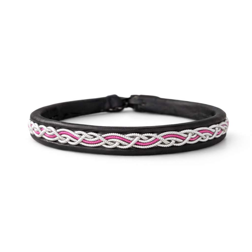 Detta armband som är ca 0,8 cm brett. Flätan är i silvrig tenntråd med en dekorativ cerise slinga i mitten. Flätan är fastsydd på läderbas i svart av naturgarvat renskinn. Armbandet har en renhornsknapp som knäppning.