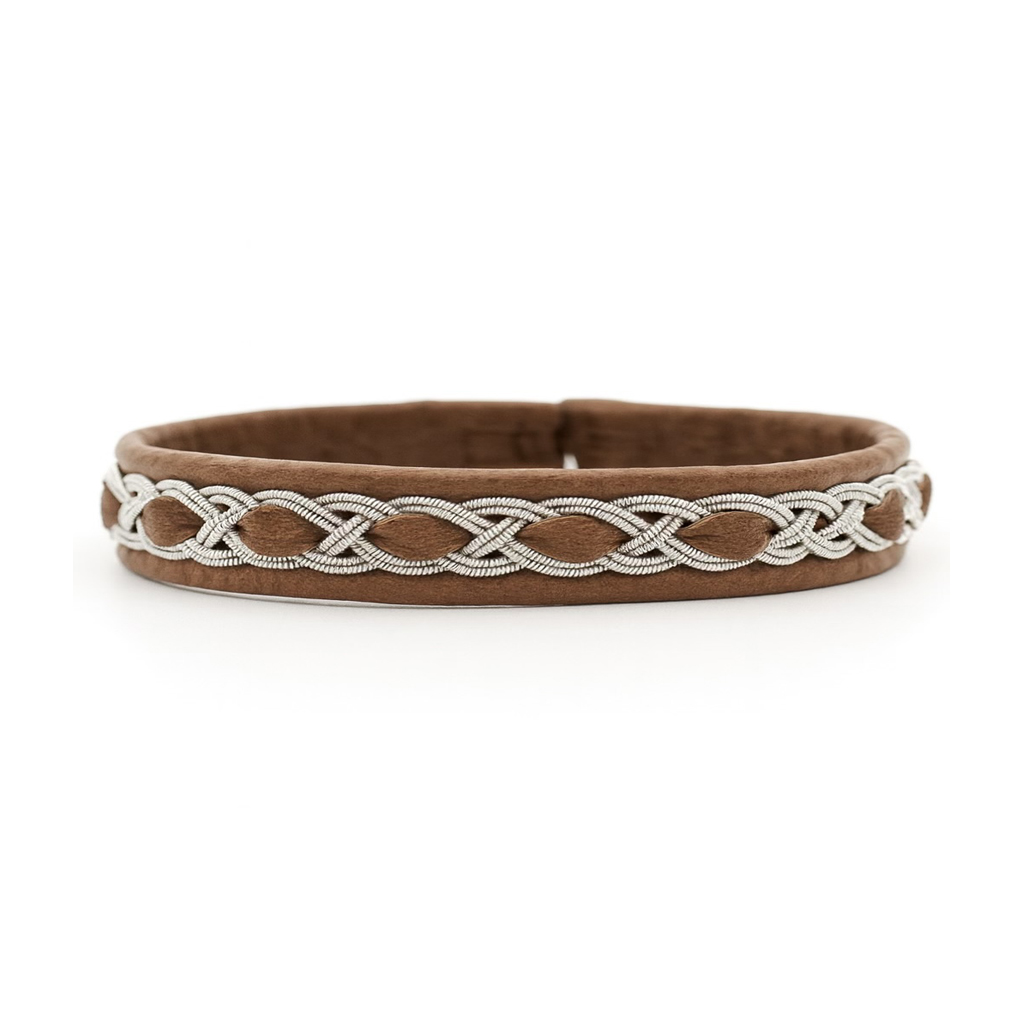 Ett av våra bredare armband som är ca 1,5 cm brett. Flätan i tenntråd har ett brunt inflätat läderband och är fastsydd på läderbas i brunt naturgarvat renskinn. Armbandet har en renhornsknapp som knäppning.
