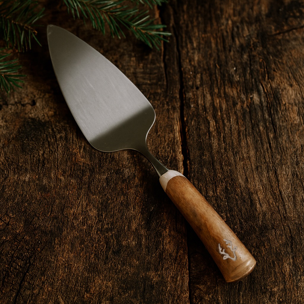 Servera dina bakverk med stil! Denna handgjorda tårtspade har ett elegant handtag av äkta renhorn, där varje form är unik. Ett vackert hantverk som förvandlar varje fikastund till en liten ceremoni.